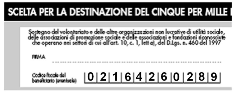 - compila la scheda fornita insieme al CUD dal tuo datore di lavoro o dall’ente erogatore della pensione, firmando nel riquadro “Sostegno del volontariato…” e indicando il codice fiscale: 02164260289;